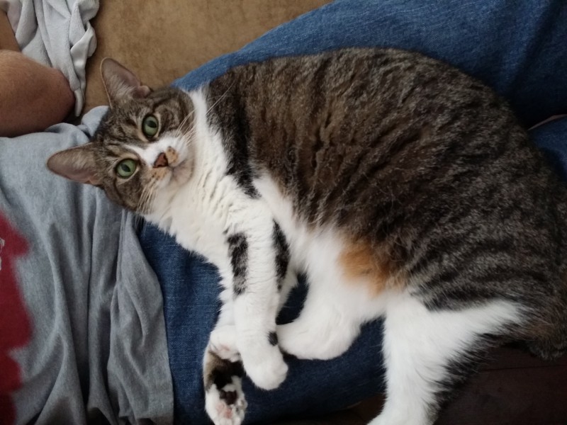 Mini is an easy going cat who is purr-fectly content to lay in your lap and take a nap. Other times she gets a burst of energy that will send her “galloping” through the house meowing especially if mosquito hawks have found their way inside. She is incredibly affectionate, loves having her chin scratched but also love the occasional play fight. She loves playing with string/yarn, feathers, toy mice and anything else small that she can bat around the floor (usually my daughter’s hair-ties). She loves curling up in/on boxes and trying to squeeze into any nook or cranny she can squeeze herself into. She loves sitting on the window sill on a warm day and she will go bonkers over some dried catnip or toys with catnip in them.